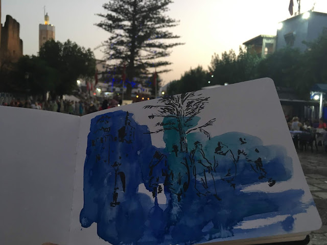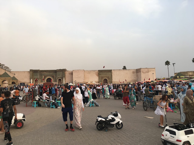 Não conhecia Meknés, e rendi-me por completo. Ao fim do dia a enorme praça El Hedime tem um encanto muito especial. quase sem turistas, tem uma animação genuína, sons de crianças a brincar, esplanadas com chás de menta, músicos, mulheres aperaltadas e maquilhadas, vendedores de mil coisas, avestruzes gigantes e até um macaco vestido de Ronaldo para quem queira com ele tirar uma foto. toda esta agitação - banhada por uma risa morna e uma luminosidade alaranjada - se transforma então, paradoxalmente, numa imensa tranquilidade
