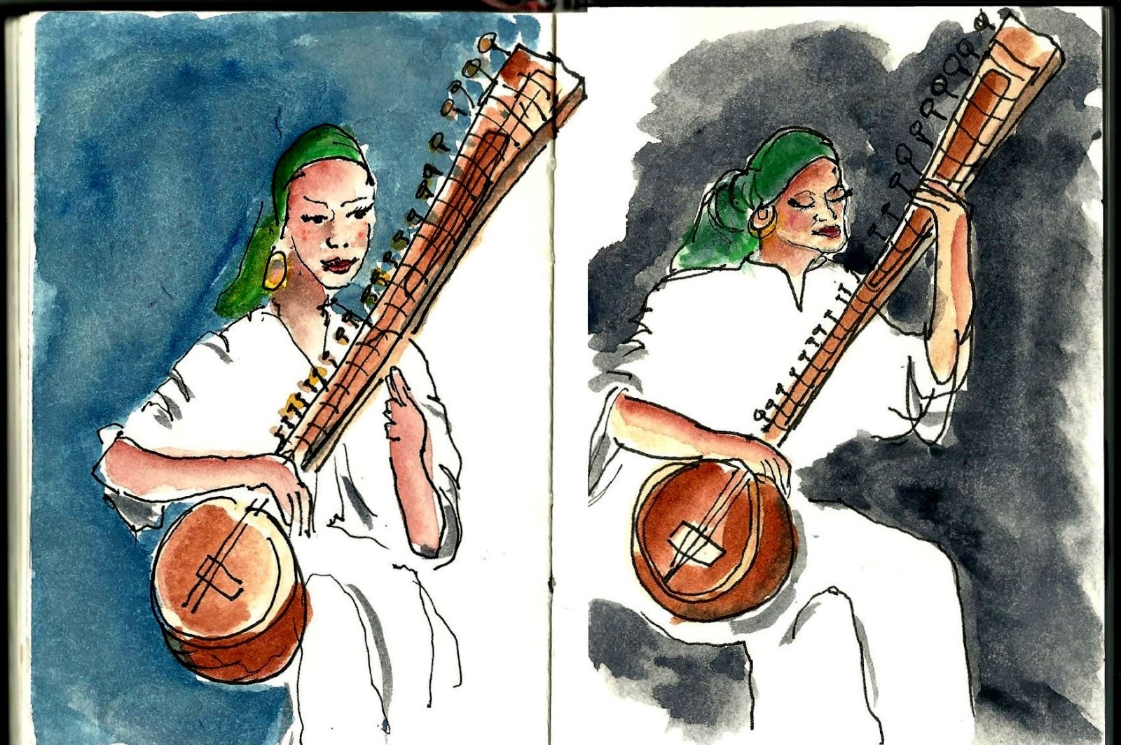 Desta vez, desenhar foi pior: quase não havia luz, foi tudo feito às escuras, ficou uma trapalhada, mas ponho aqui os desenhos porque foi um concerto muito bonito, de que não me quero esquecer.